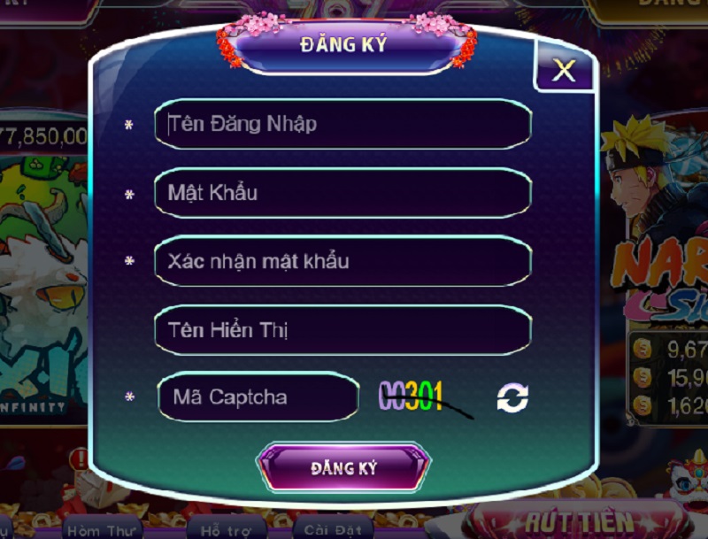 • Bước 2: Tiếp đến là nhấn chọn phần đăng ký trên màn hình và điền các thông tin như tên đăng nhập, mật khẩu, nhập lại mật khẩu và mã xác nhận.